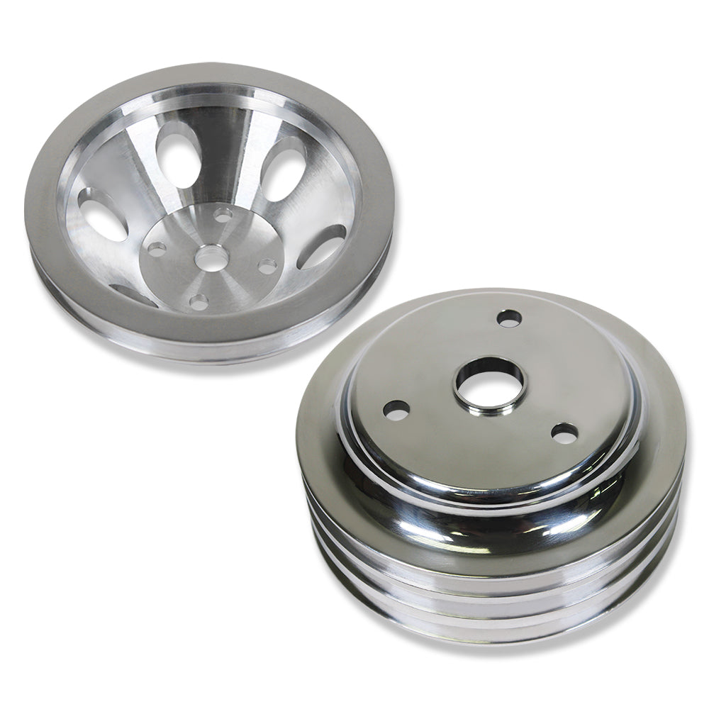 Polished Aluminum SBC Chevy 1 & 3 Groove Long Water Pump Crankshaft Pulley Kit