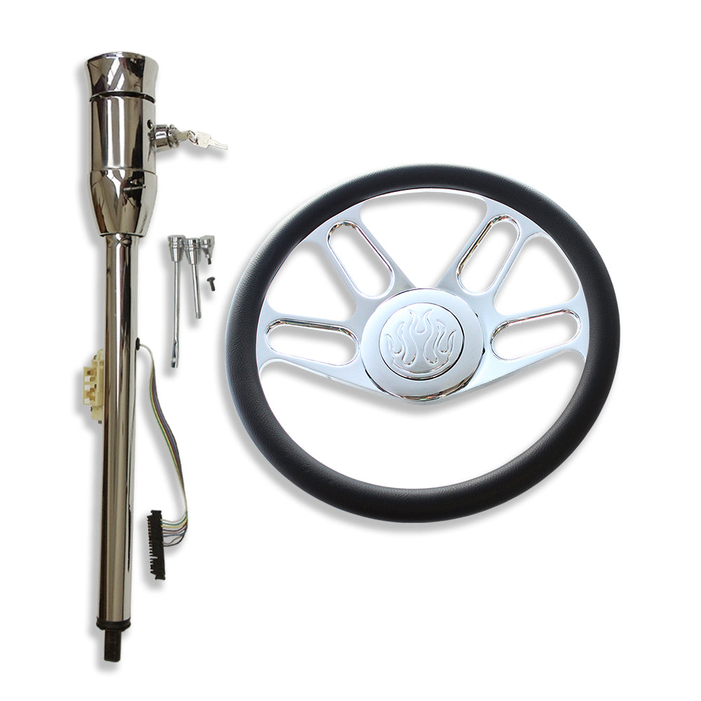 28" GM Auto Steering Column & 14" Billet Steering Wheel & Flamed Horn Button
